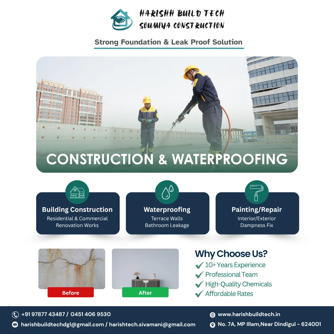 Looking for the most reliable construction and waterproofing service in Dindigul? With two decades of on-ground expertise across Tamil Nadu, Harishh Build Tech delivers engineered solutions that stop leaks permanently and build structures that stand the test of time. We prioritize your peace of mind by offering transparent pricing, 3D design previews, and 100% weather-proof guarantees on every residential and commercial project. Don’t let damp walls or structural cracks devalue your property—our experts are ready to provide a free site inspection and a customized quote today. Join thousands of satisfied homeowners in Tamil Nadu and secure your investment with the region’s most trusted building partners.
